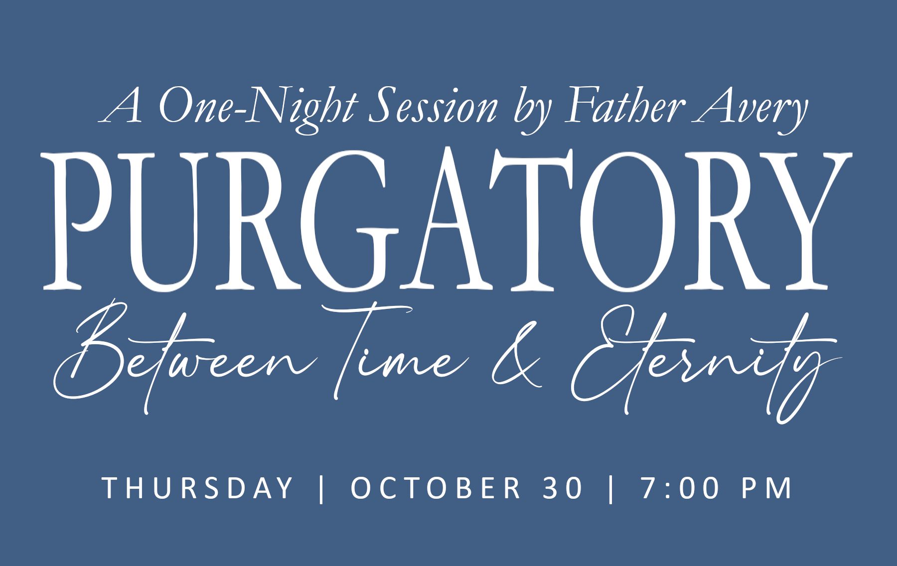 Come join us on October 30 at 7:00 PM in the Parish Life Center for a one night presentation on Purgatory: Between Time and Eternity. Father Avery Daniel will discuss the temporal, suffrage, and spiritual realities behind purgatory, sourcing from both Scripture and Tradition of the Church.